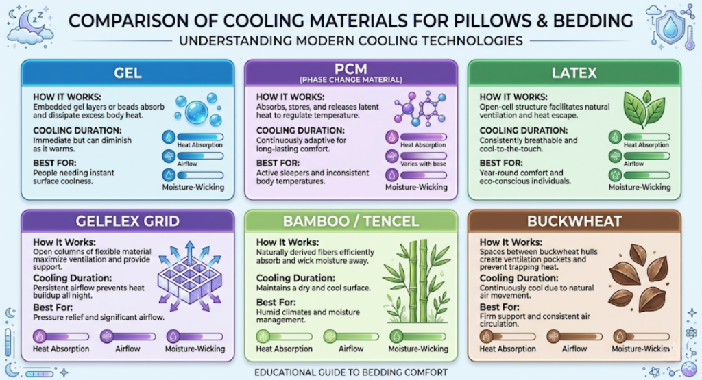- Buying a “cooling” pillow without checking the technology – A cool-to-touch cover isn’t enough. Look for PCM, gel infusion, or breathable fill like latex.